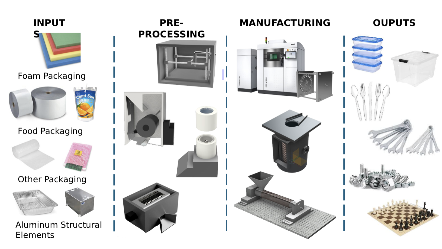 The final outputs are regolith-derived molds, composite 3D-printer filament, injection-molded parts, and cast aluminum components.
