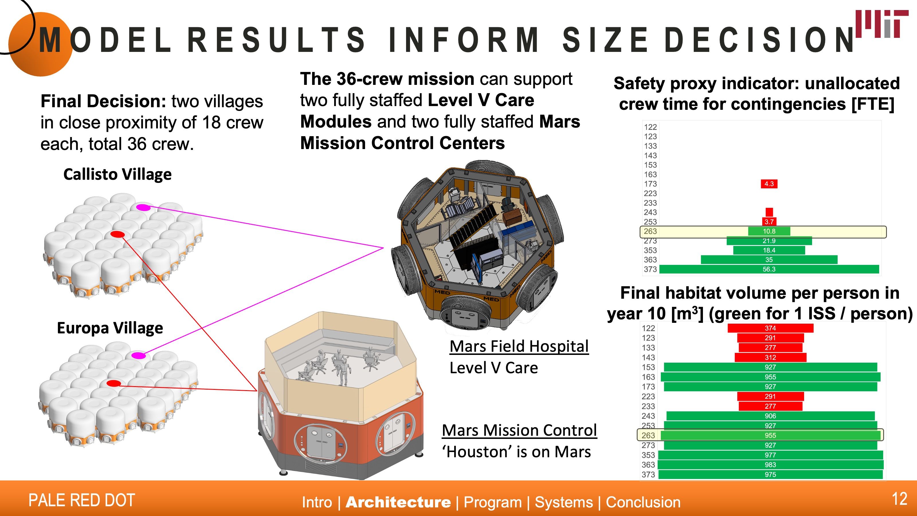 From this baseline, the questions of crew size and mission duration were traded with lifetime cost and dependency on Earth resupplies. The architecture model calculates a variety of cost, benefit and risk metrics. The outcome, Pale Red Dot, proposes two villages of 18 persons each, total 36 persons, in close proximity, with a lifetime cost of $81 billion.