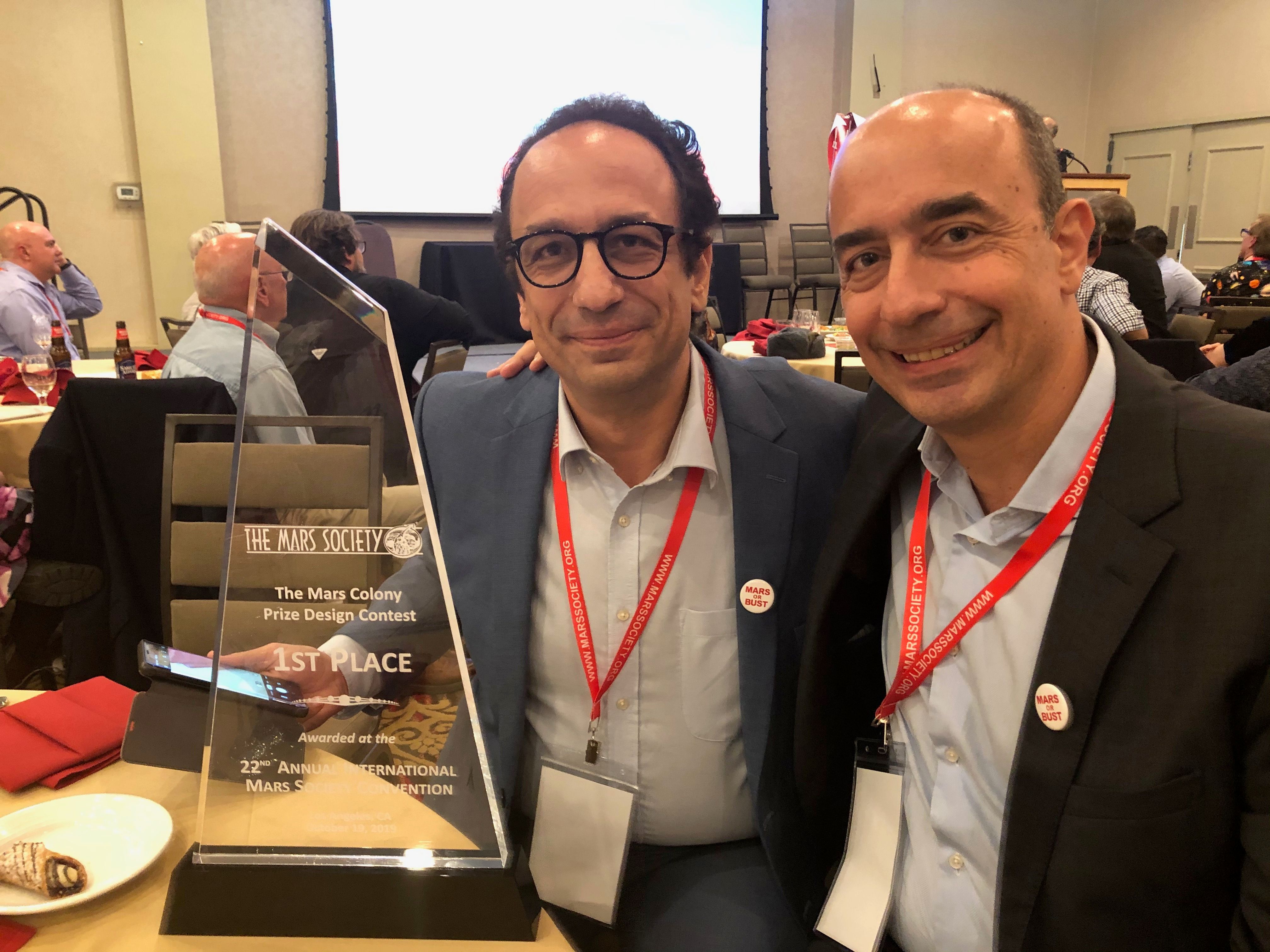 Photo: Star City creators, brothers Dr. Alexandros Lordos (left) and George Lordos (right) at the 22nd Annual Mars Society Convention in Los Angeles, CA. George was the creator of the Star City concept and was responsible for the system architecture and techno-economic studies and Alexandros developed the psycho-societal elements. The concept and sketches created by George and Alexandros were developed into a complete architectural design by Delta Architects (Athens, Greece).