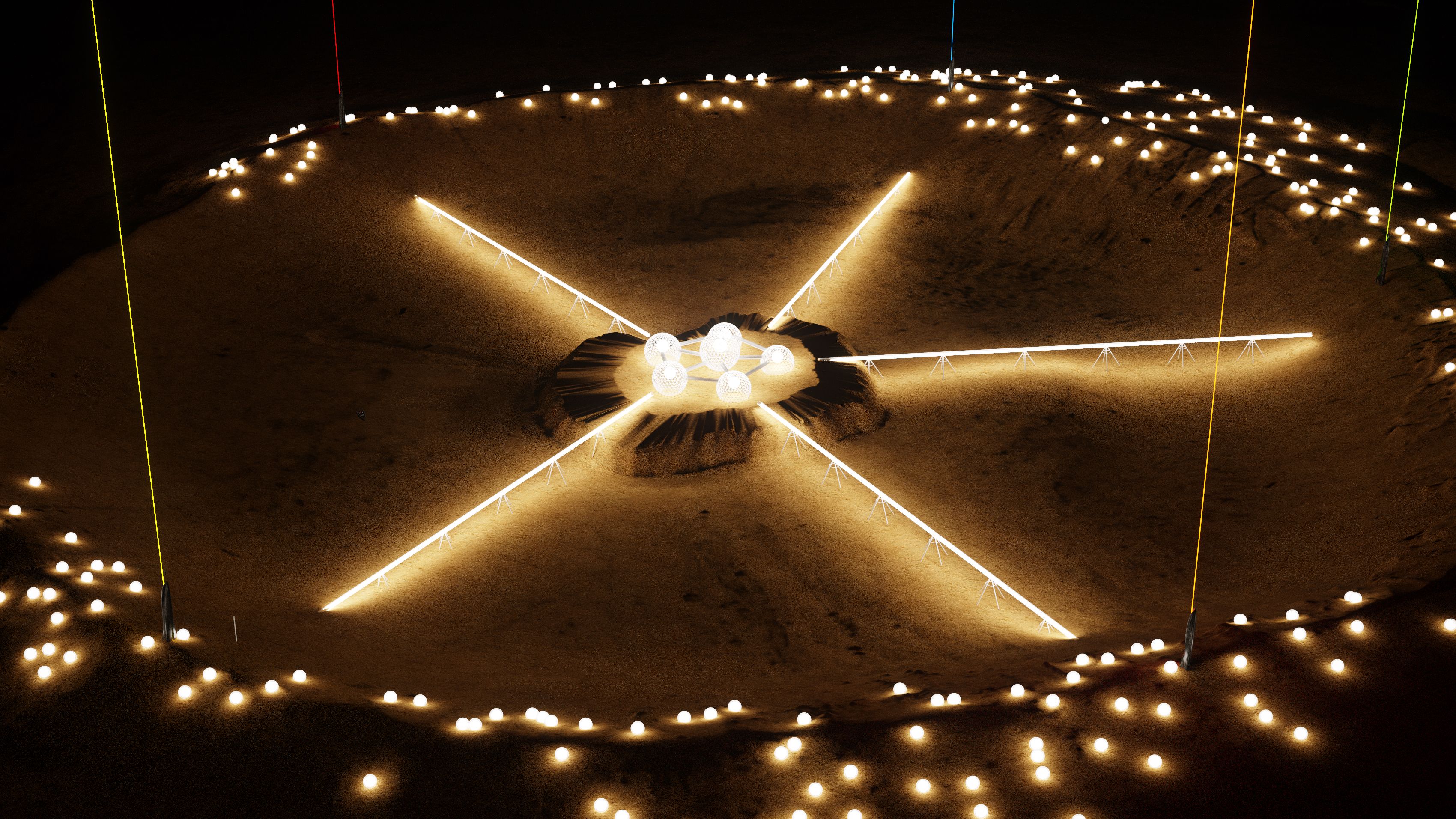 Figure: The five villages start out from 12 persons each, grow to 200 persons each and interconnect their tunnel networks to give rise to a resilient 1,000 person city on Mars. Star City's five villages are energy-rich, with powerful color lasers overcoming planetary albedo so as to be visible from backyard telescopes and inspire children back on Earth. Image credit: Delta Architects (Athens, Greece).