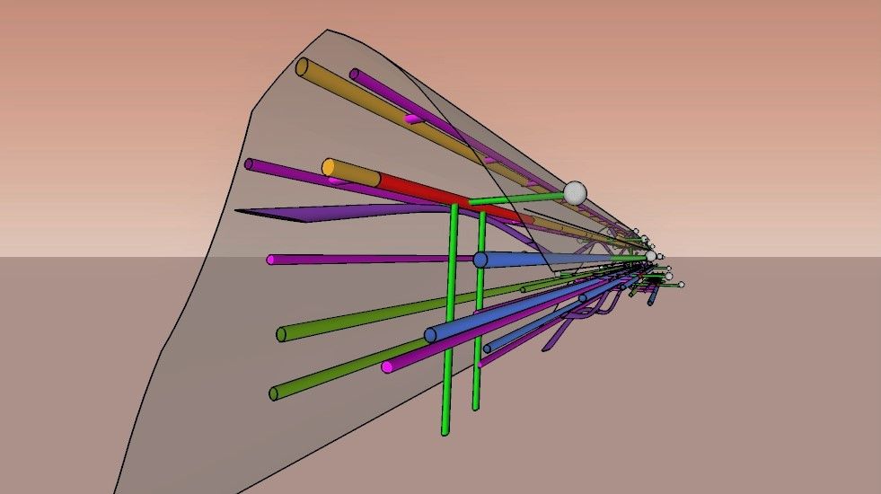 Figure: Most of Star City is underground inside robust, radiation-proof tunnels. The tunnel network connects the five villages to each other, to ground-level garages housing pressurized rovers and to sunlit domes with panoramic views of the Martian horizon. Shown in the figure are pedestrian (bright green), vehicle (purple), residential (yellow), leisure (red), industry and logistics (blue) and farming (green) tunnels. Image credit: Delta Architects (Athens, Greece).