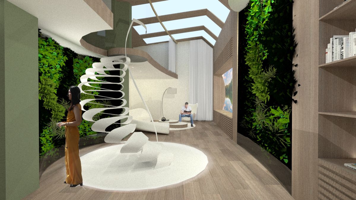 Figure: The living room of a private residence inside a radiation-proof tunnel, with artificial skylight. Image credit: Delta Architects (Athens, Greece).